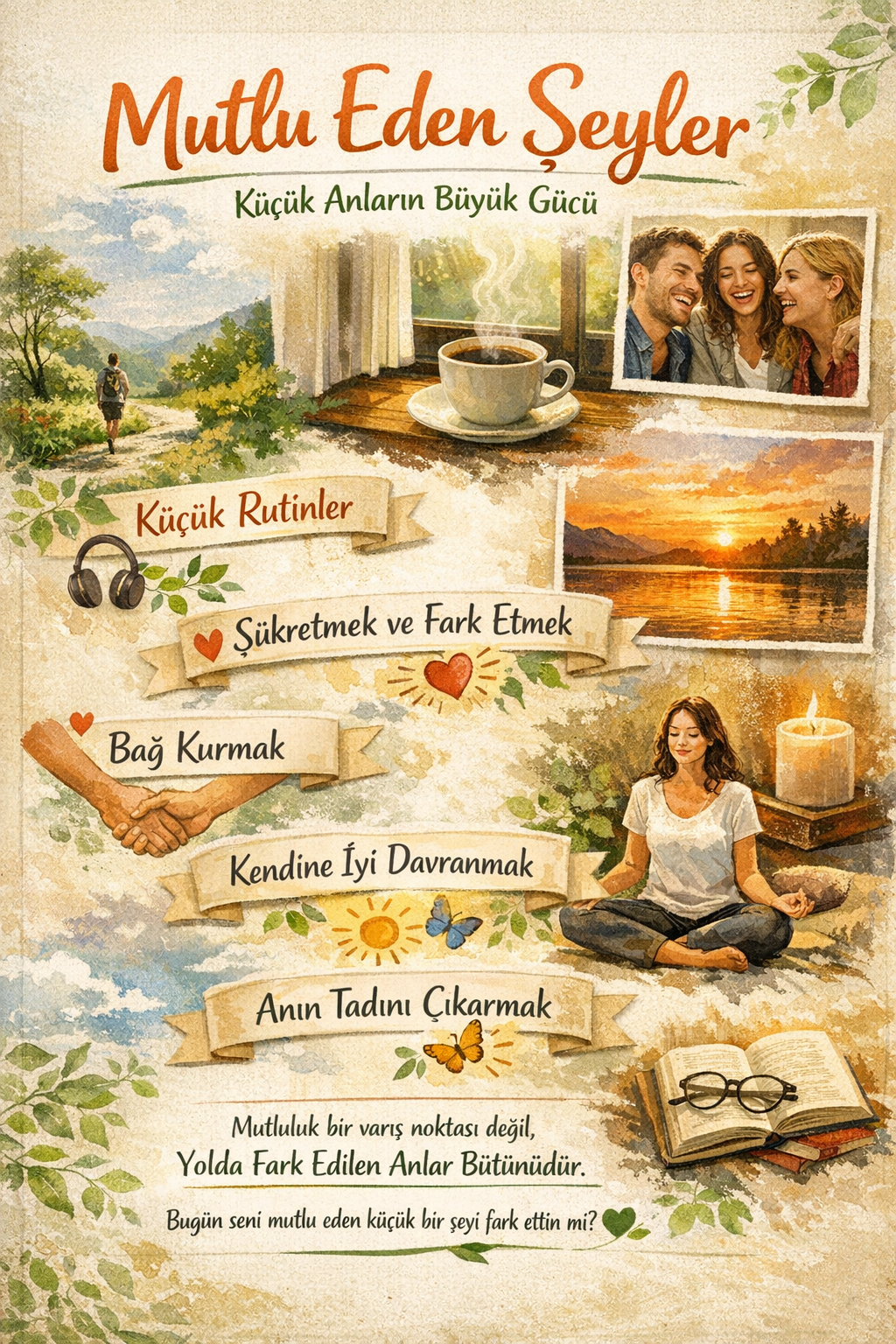 Mutluluk bir varış noktası değil, yolda fark edilen anlar bütünüdür. Büyük değişimler beklemeden, küçük güzelliklere alan açtığımızda hayat daha yumuşak, daha anlamlı hale gelir. Bugün seni mutlu eden küçük bir şeyi fark ettin mi? 🌿
